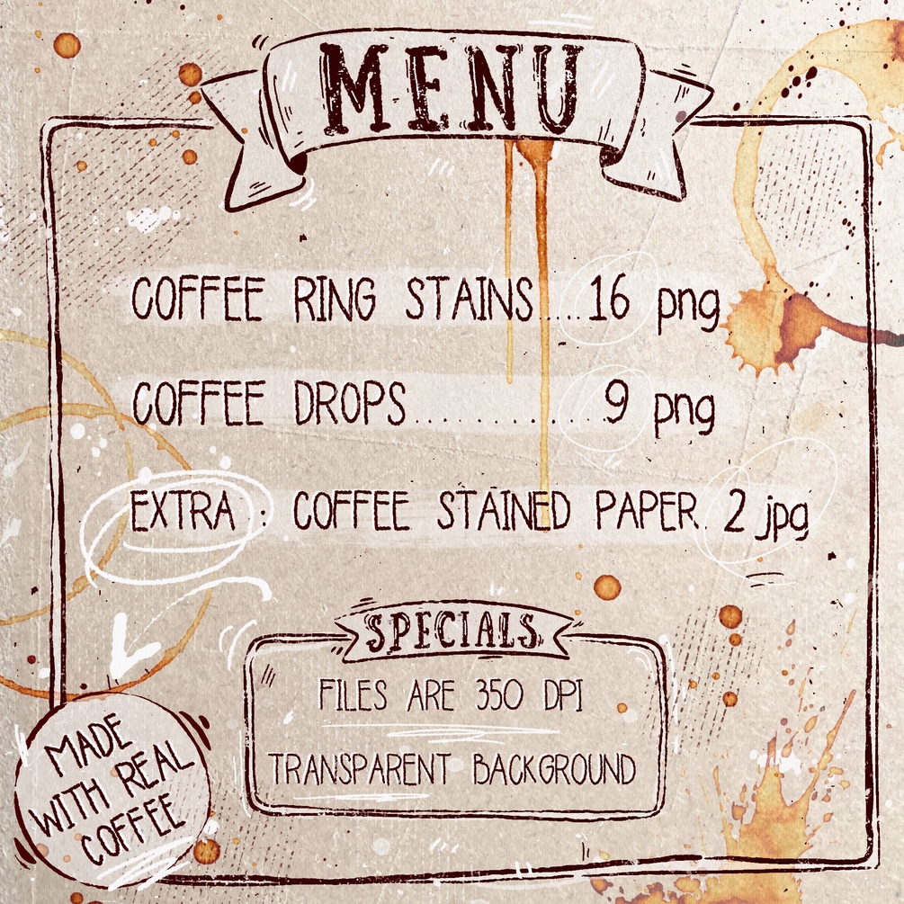 16 coffee stain png files, 9 coffee drop png files, 2 extra coffee stained paper